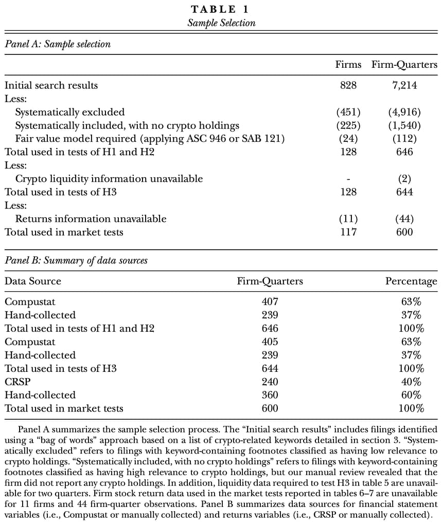 The authors analyze a sample of publicly traded U.S. firms that reported cryptocurrency holdings between 2019 and 2023. Their data were sourced from: